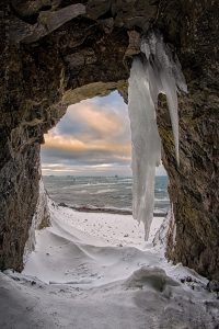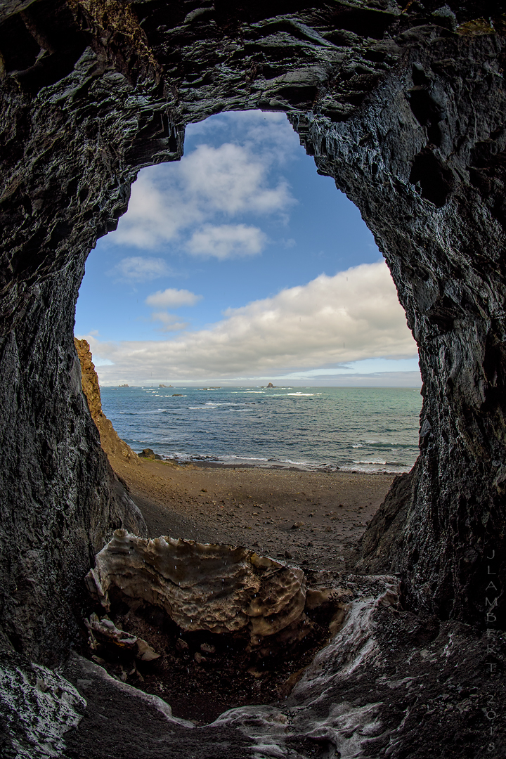Este fin de semana, salí a recorrer la isla hacia el Sector Drake. Allí existe una pequeña cueva que en «verano» no tiene mucho atractivo. Para esta fecha, el escenario cambia drásticamente mostrando cómo el efecto de la reducción de temperatura ha congelado la caída de agua que se cuela por entre las rocas. (haz click en imagen para ver toma hecha en enero).