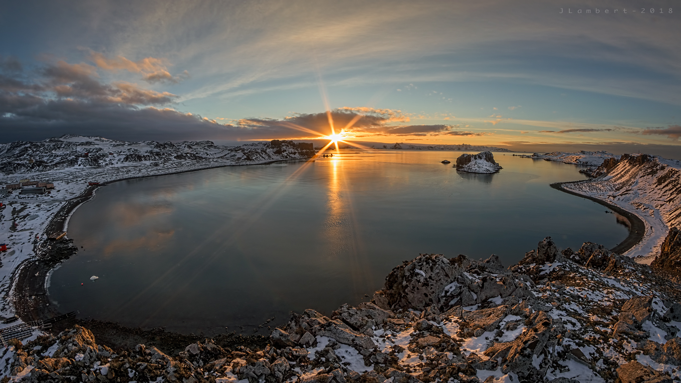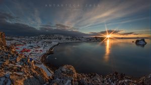 Les dejo esta foto hecha el día domingo a las 07:30 aprox. donde se aprecia a la izquierda de rojo, la Base Frei y la Base Rusa, en color crema.