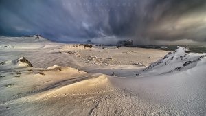 El domingo recién pasado, aprovechando el buen tiempo (-2 grados y viento de 60 km/hr) , nubosidad parcial y un sol que prometía una bella puesta. Caminé al sector del Drake a ubicar algún punto interesante para mi «sunset». Con ese viento el trípode había que mantenerlo SIEMPRE sujeto, pues de lo contrario se volaba!!. Para estas condiciones, hice una fotografía preliminar desde la cima en la que se observa la playa congelada y las nubes cargadas que precipitan a las distancia: