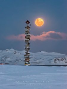 Sin embargo, cuando el sol ya se puso en el horizonte y volví por el valle hacia la Base, observé que la luna estaba apareciendo entre las montañas. Era una luna llena de una calidez alucinante que contrastaba con el azul de la hora. Una escena que no se podía obviar!!!!. Volví a armar el equipo y me ubiqué de manera que el Tótem Chileno fuera parte de este cuadro Antártico en torno a la Bahía fildes: